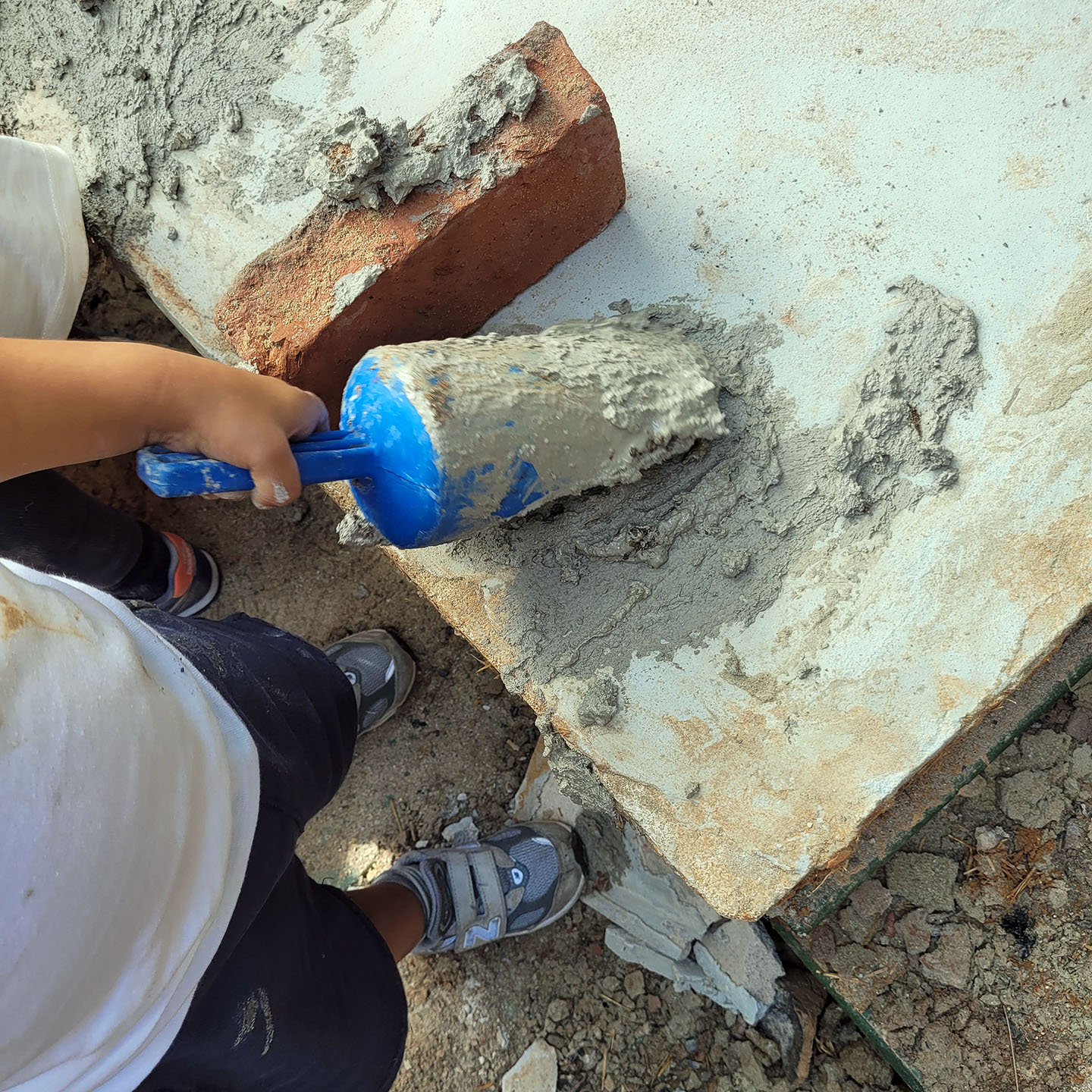 Firstly, we had to dismantle the old oven and clean the bricks processed in the oven - these, of course, should be used again. The groups got to work immediately after the kindergarten started in September. They worked methodically, making their way to the foundation of the furnace. The outer layer of the clay-straw mix was removed first, which proved to be much trickier to remove than any of us had anticipated. Small shovels were used to scrape and knock until the clay slowly crumbled away. To make the work easier, we provided the children with water. Within a day the outer layer was removed and the bricks, burned by the fire, became visible. Now it was time to remove the bricks. Under the watchful eyes of the teachers, the stones were carefully excavated one by one and set aside. Building something together is very exciting, but dismantling an existing stove is also very appealing! At the end of the demolition phase, all that remained was to clean up the construction site and then the construction of the new earth oven could begin.